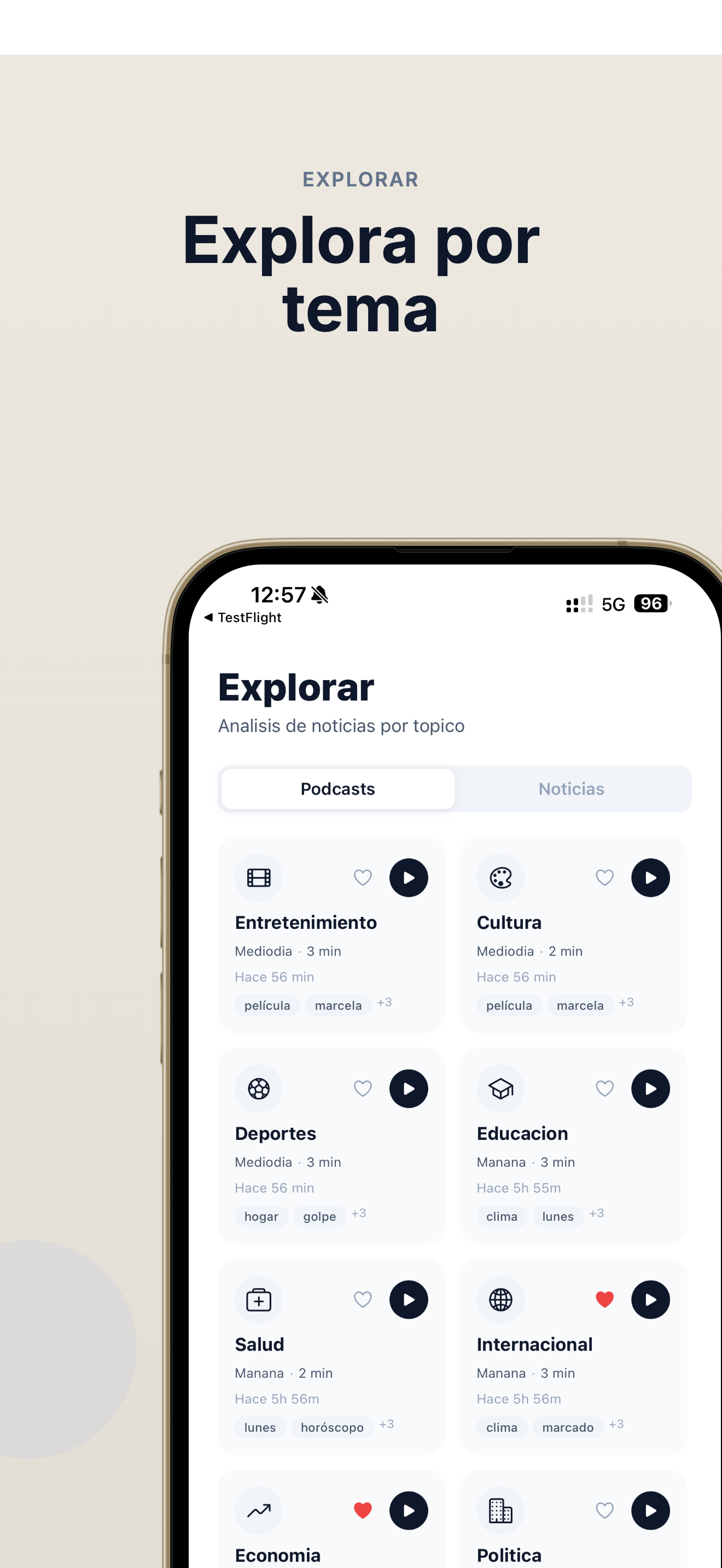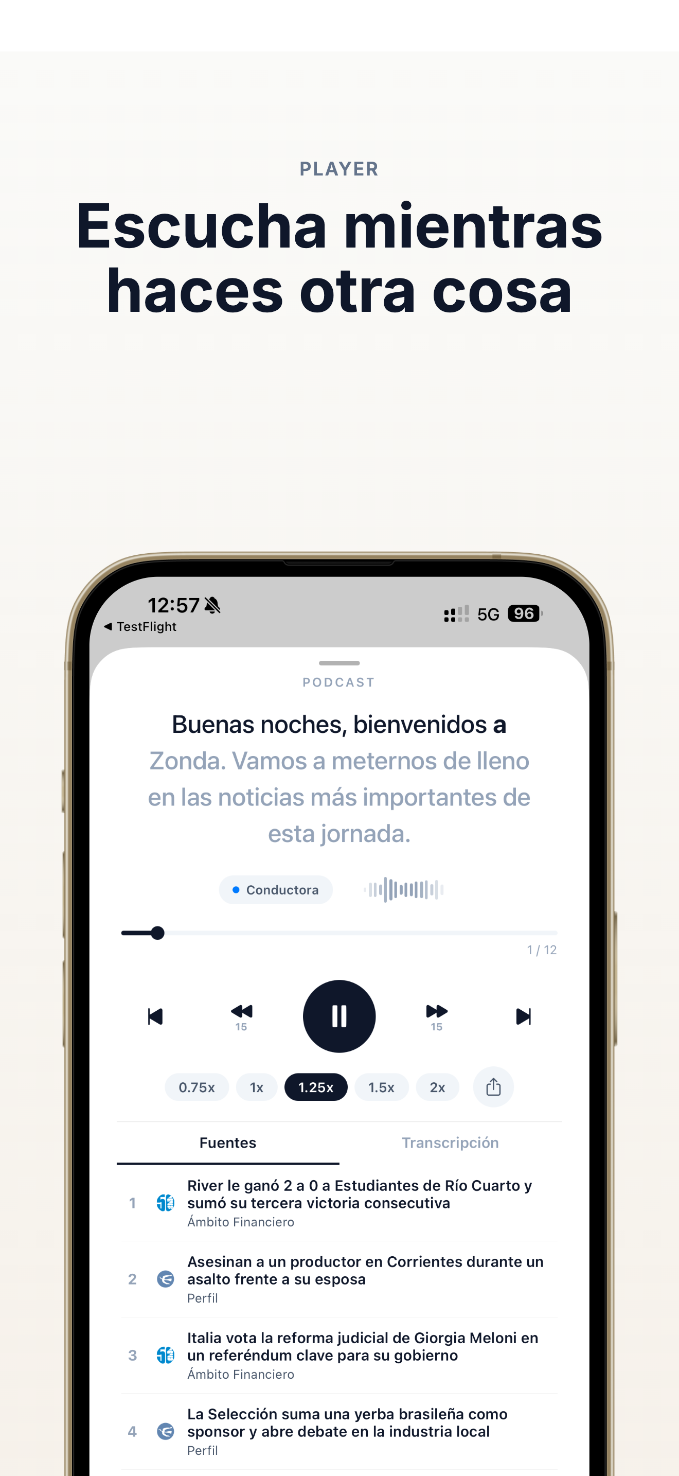 Elegis tus medios y temas favoritos. Zonda genera un resumen en audio personalizado en minutos. Escuchalo mientras vas al trabajo, al gym, o donde quieras.